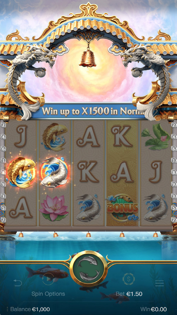 When you align a Gold Koi symbol precisely one reel to the left of a Silver Koi on the same row, a Koi pair is uniquely formed. Consequently, this alignment rewards players with two free spins. Additionally, during these free spins, all victories remarkably double in value. However, it’s worth noting that this enhanced payout doesn’t apply to Bonus Feature wins. As you delve deeper into the game, you’ll notice that its mechanics consistently present bountiful opportunities to relish these moments. Therefore, while playing, always keep an eye out for these Koi pairs and grasp the opportunity to boost your winnings.